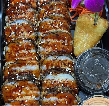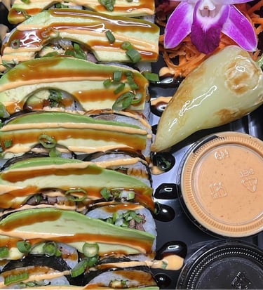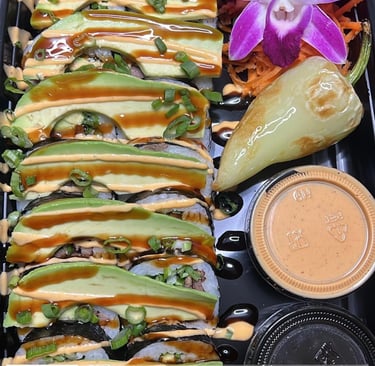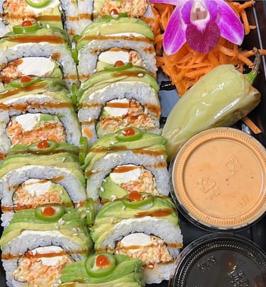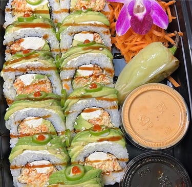 Cucumber, Cream Cheese, Avocado and Shrimp (Breaded with a spicy crab topping and grated in 3 sauces)