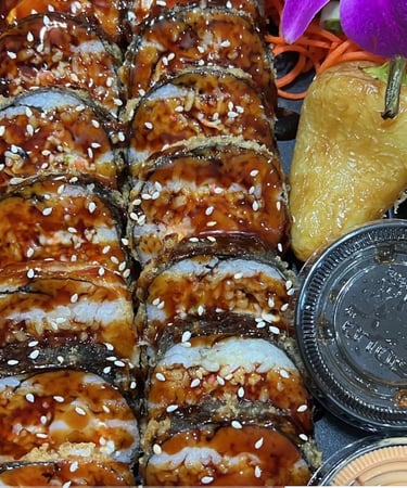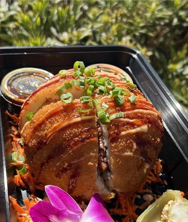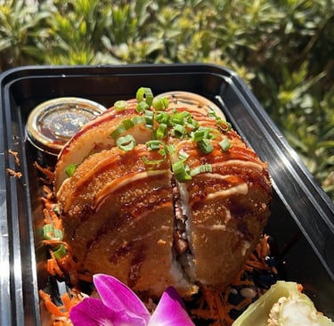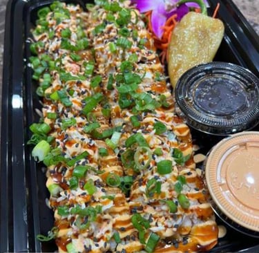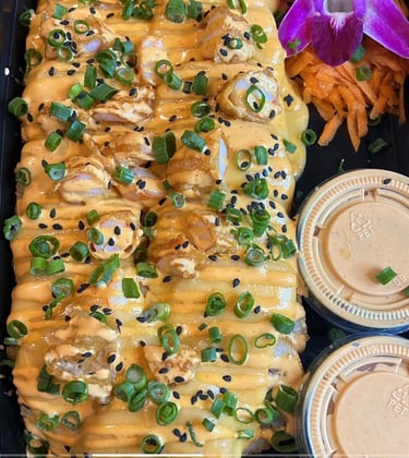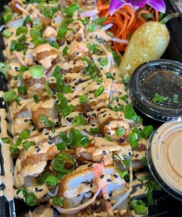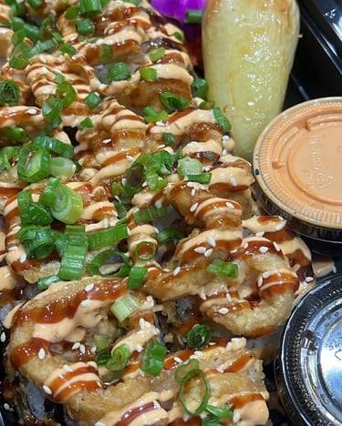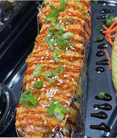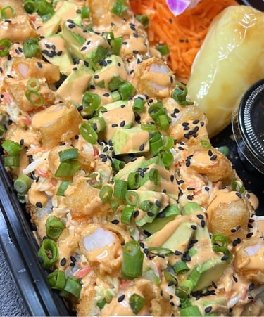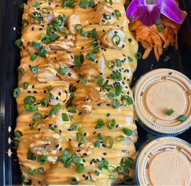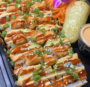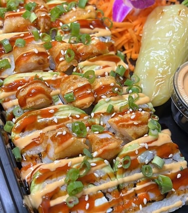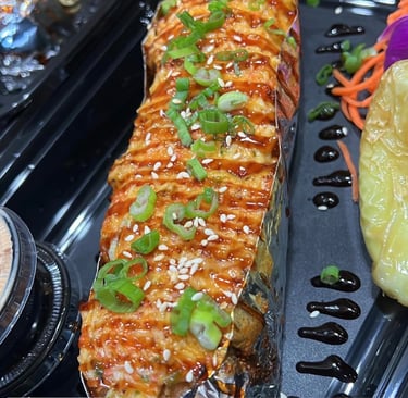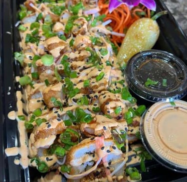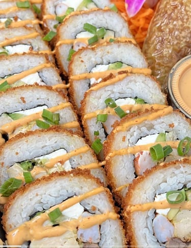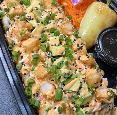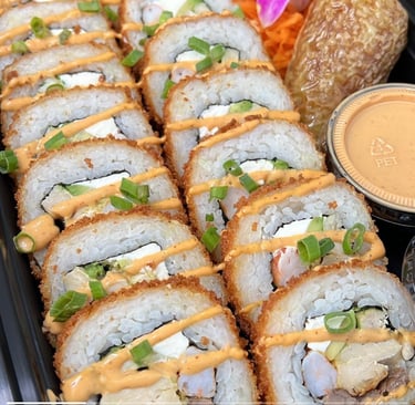 Cucumber, Cream Cheese, Avocado, Spicy Crab and Shrimp (Natural Roll with a Tempura Crunch on Top)