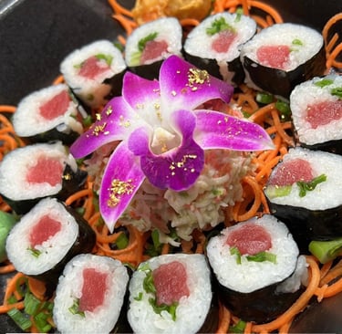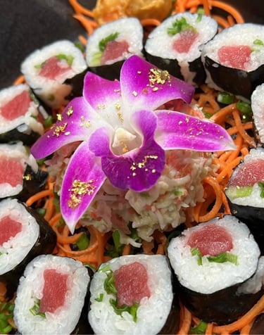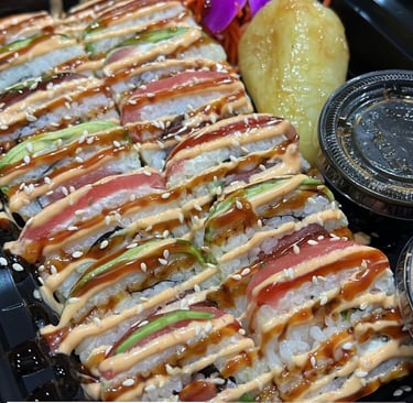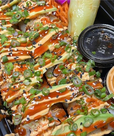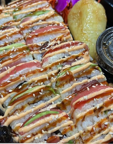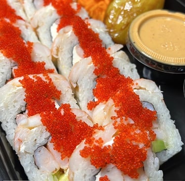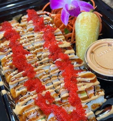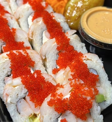 Cucumber, Cream Cheese, Avocado and Crab (Natural Roll Bathed in 2 sauces and a Tobiko Topping)