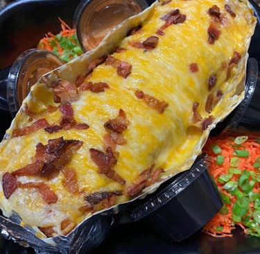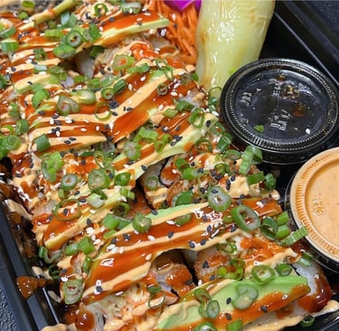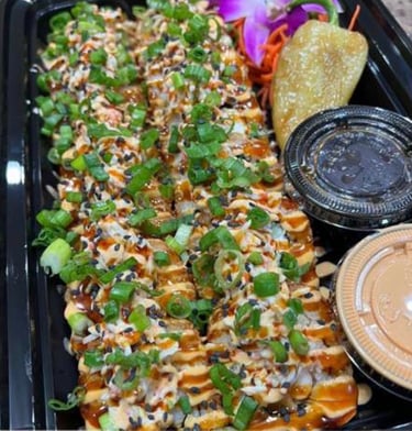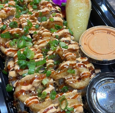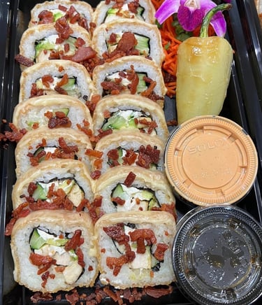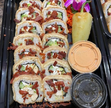 Bacon, chicken, shrimp, cucumber, avocado & cream cheese, fried with sushi sauce & spicy mayo on top