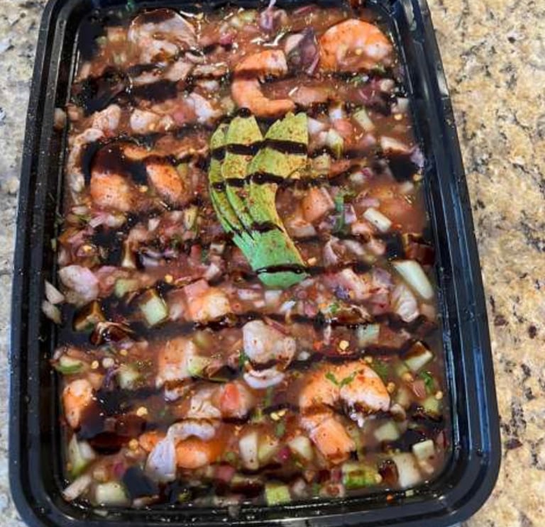 Camarón Ceviche & Pulpo (32oz) Incluyen Chips, Galletas, Mayonesa & Salsa Marisquera